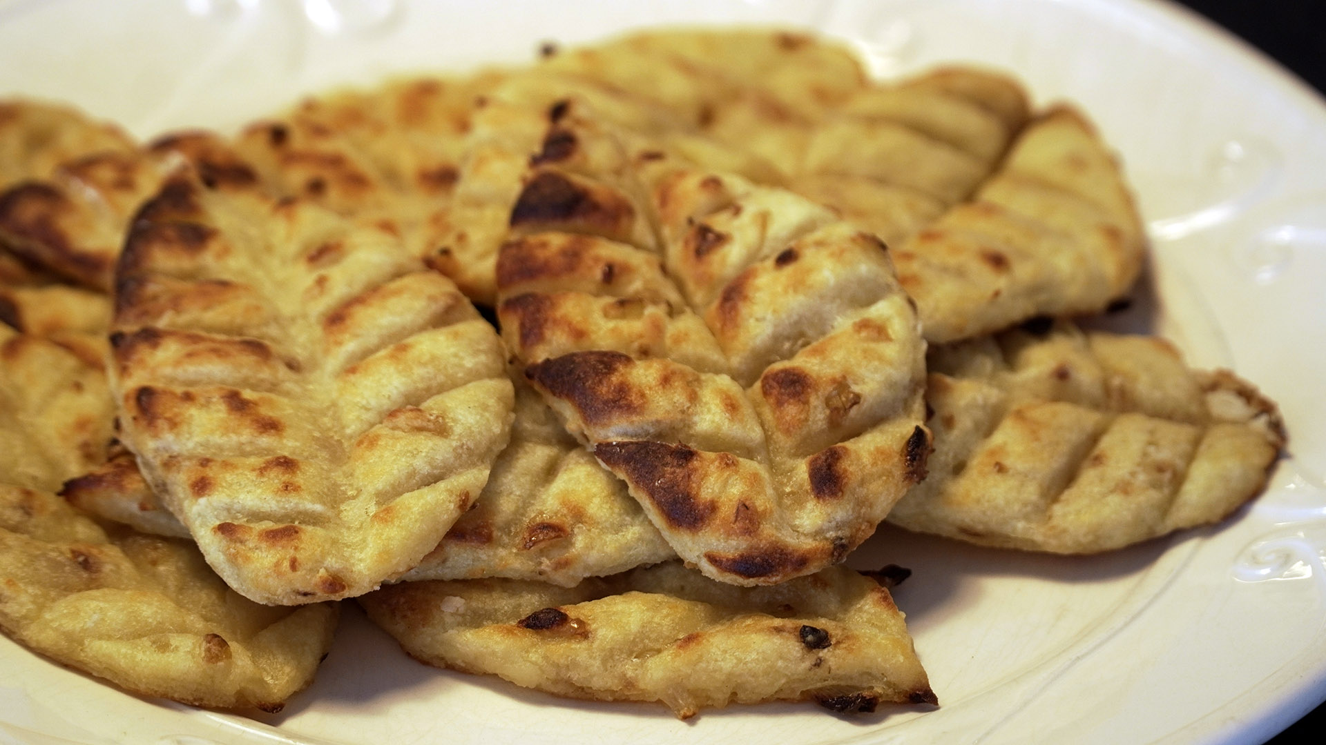 De uien snipperen, zo klein mogelijk snijden. Deze uien snippers in drie eetlepels olijfolie lichtbruin en gaar bakken. De aardappels schillen en in ruim water gaar koken. De gare aardappels door de pureeknijper in een kom knijpen, de uien toevoegen en als het geheel handwarm is de bloem er overheen strooien en het zout. Met de hand zo kort mogelijk een slap deeg kneden. Dit deeg uitrollen of met de hand uit drukken tot een dikteven 10-12 mm en hiervan blaadjes steken, deze van nerven voorzien en op een ingevette bakplaat met siliconenmat leggen. Je kunt uiteraard alles soorten vorm aan dit gerecht geven. In een hete oven op 200 graden ca. 20 minuten van een bruin korstje voorzien. Je kunt uiteraard met saampjes gaan experimenteren, door er nootmuskaat of verse kruiden aan toe toevoegen etc, de smaak aanpassen aan het hoofdgerecht.
