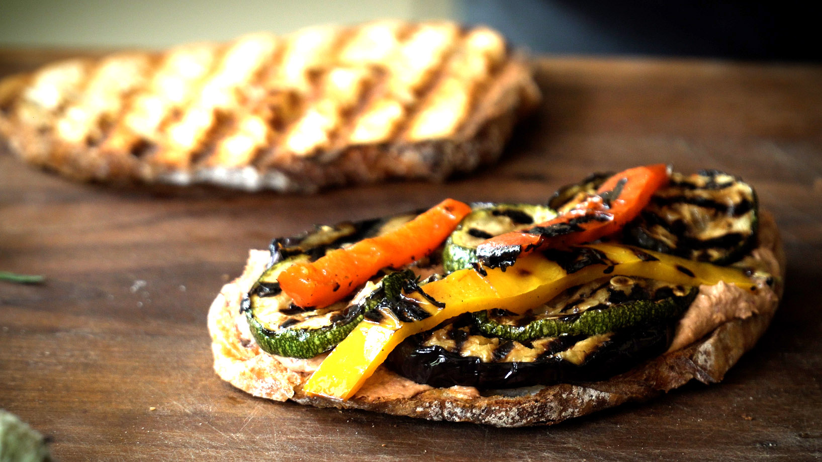 Sandwich kidneybonenpaté met gegrilde groenten en pesto