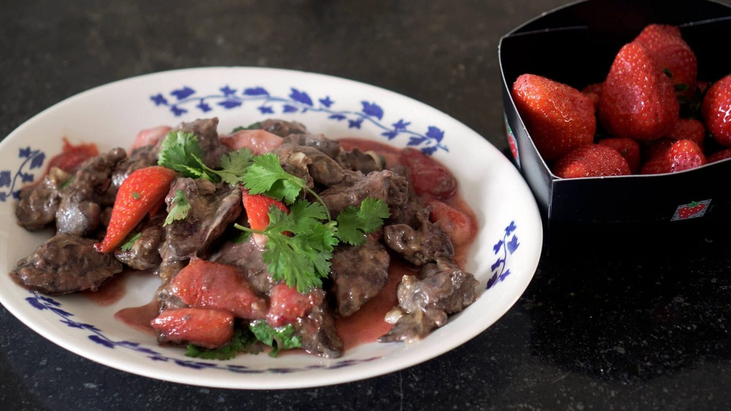 Onno Kleyn is culinair schrijver, auteur van het naslagwerk De Grote Kleyn en het wijngeweten van De Volkskrant. Samen met zijn dochter Charlotte schrijft Onno momenteel de historie van de kookboeken in Nederland. In zijn naspeuringen stuitte hij op het gebruik van fruit in hoofdgerechten, een ware hype in de jaren zeventig van de vorige eeuw, al sprak je in die tijd nog van een trend. Met die inspiratie maakte Onno bij wijze van culinair docudrama een gerecht met kippenlevers en -schrik niet- aardbeien.