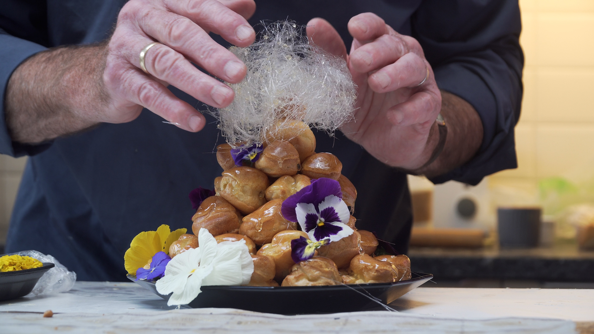 Een croque en bouche (letterlijk vertaald: kraakt in de mond) is een Franse bruidstaart die is opgemetseld uit soesjes die met banketbakkersroom gevuld zijn en aan de buitenkant gesuikerd zijn. De Franse voorbeelden zijn imponerend hoog en complex, maar Cees Holtkamp heeft er een ‘Hollandse’ versie van gemaakt die ook thuis te maken is. Cees wordt bijgestaan door zijn kleindochter Stella en we leren ondertussen ook hoe je spinsuiker maakt.