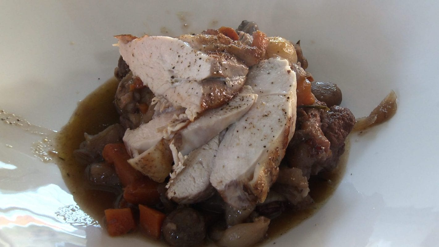 -Giet bij de kip gelijke delen rode wijn en bouillon of, als er geen bouillon voorhanden is, alleen rode wijn.