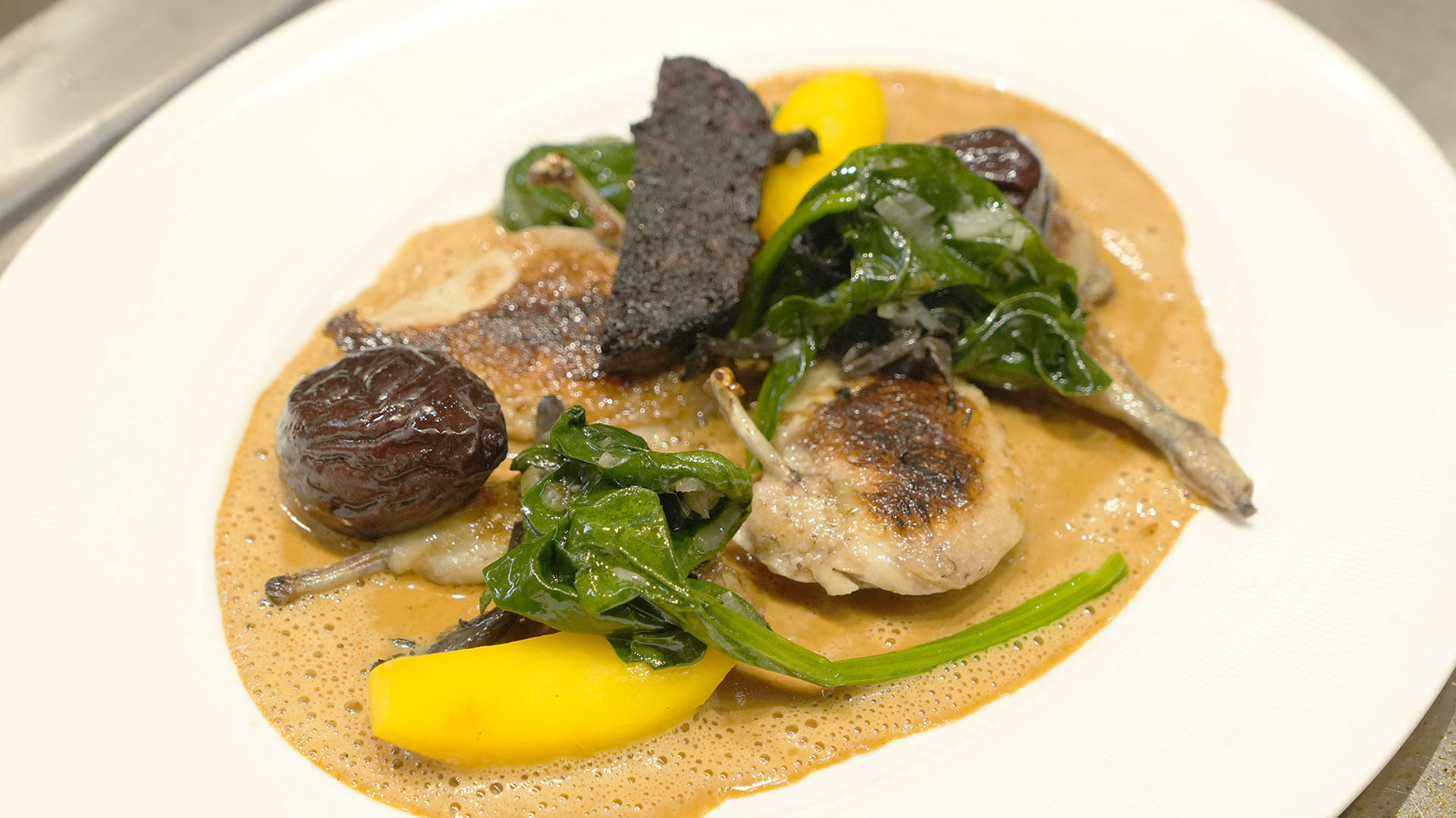 Rik de Jonge, chef de cuisine van Bistro Madeleine in Utrecht, pareert een kwartel en braadt de filets op het karkas. Omdat Rik liefhebber is van een rijk gevuld bord serveert hij de kwartelfikets met de gekonfijte boutjes, rapen, spinazie, pruimen, bloedworst en met een rijke room/mosterdsaus.