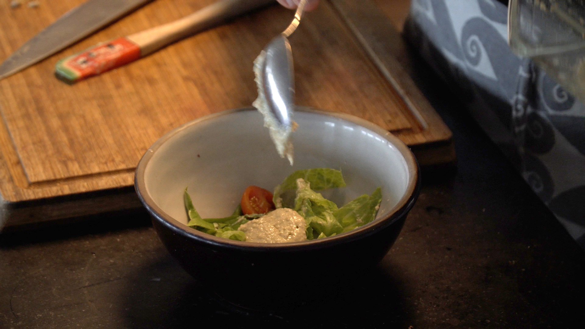 Hoe grappig is het als op Foodtube de keukenpersonages op elkaar gaan reageren? Maroeska Metz liet zich inspireren door Jigal Krant en maakte in een handomdraai een verse slasaus van sesamzaad, olijfolie, peper en citroen waarmee je van bijvoorbeeld in combinatie met fijngesneden spitskool een frisse en volwaardige salade maakt. Met geroosterd sesamzaad maakt ze in feite een soort tahin. Meer over tahin leer je van Esther Erwteman.