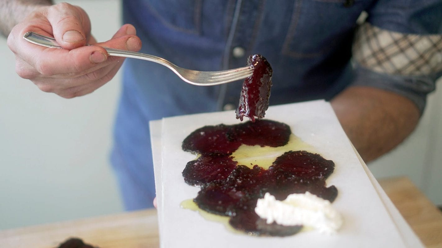 Snijd de bieten in flinterdunne plakjes. Een mandoline is hiervoor ideaal.