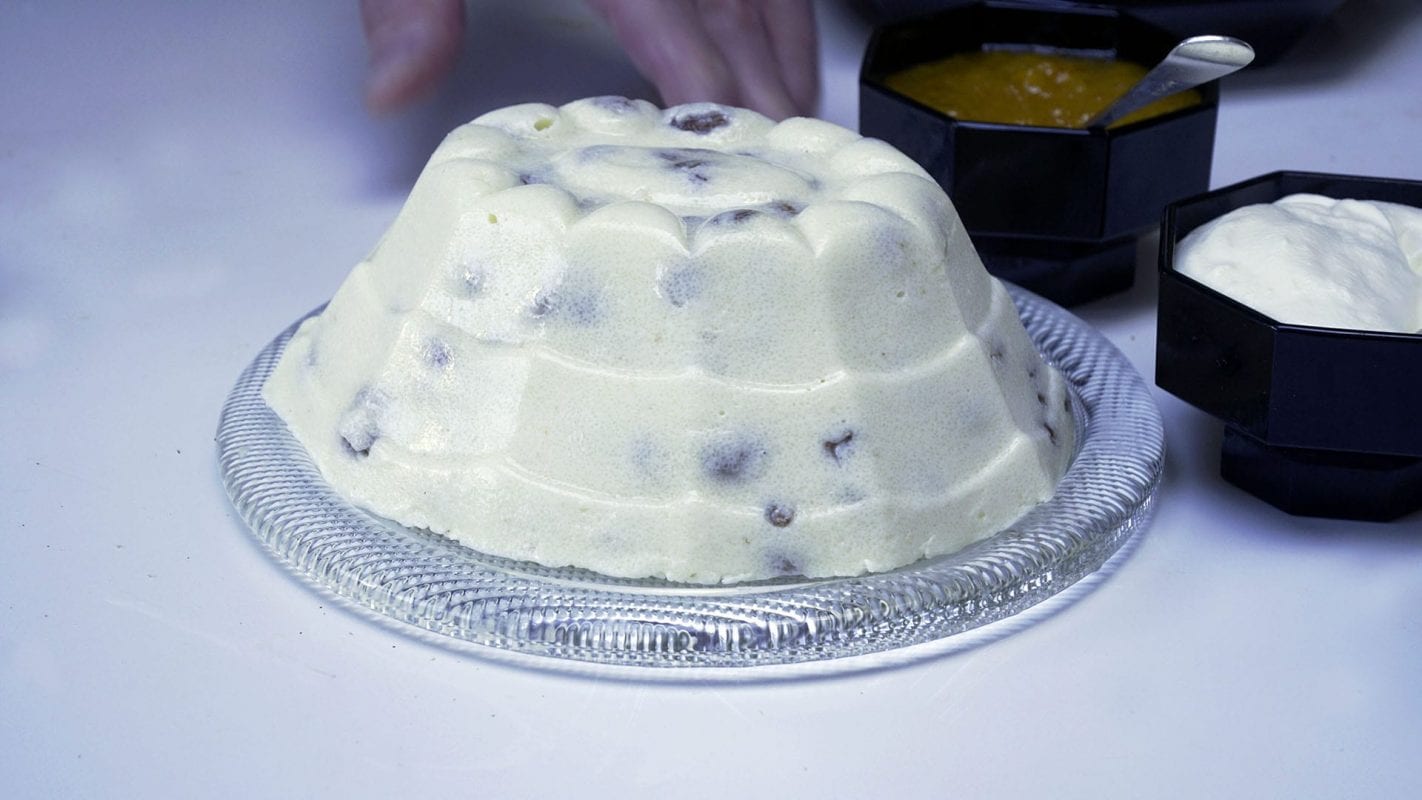 Cees en zijn kleindochter Stella Meijles maken de pudding compleet met abrikozensaus en losgeslagen room. Het recept uit De Banketbakker werd iets aangepast en de nieuwe versie kwam terecht in Crisis koken het kookboek voor de quarantainekok met recepten van vooraanstaande cuisiniers.