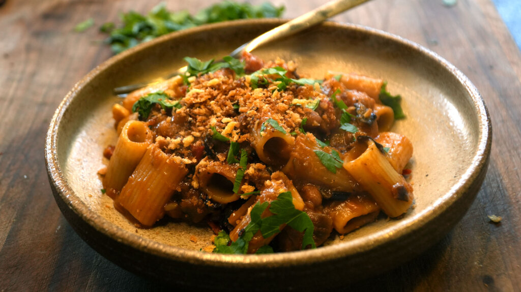 Uit zijn boek Ode, dat geheel gewijd is aan de aubergine, maakt Jigal Krant een pasta met aubergine, bonen en kleine tomaatjes.