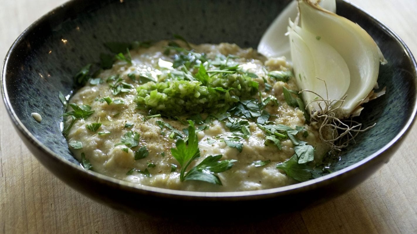 Jigal Krant, auteur van het succesvolle kookboek TLV over de keuken van Tel Aviv, maakt messabecha. Het lijkt op choemoes, maar het is grover van structuur en wordt warm gegeten.
