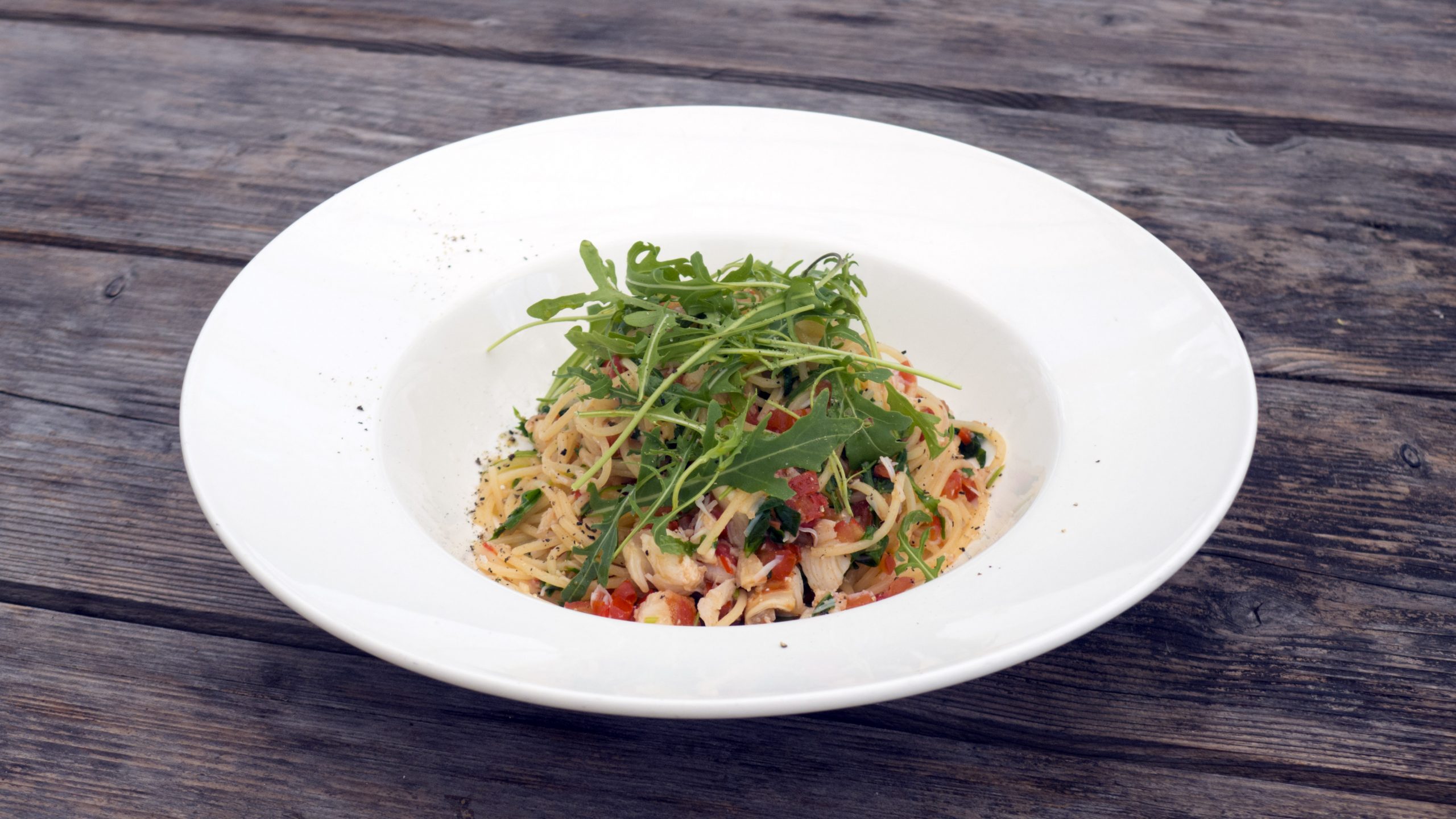 voor 3 personen: krab van ongeveer 800 g olijfolie 3 knoflookteentjes 2 pepertjes 3 tomaten fijngesneden flinke hoeveelheid rucola fleur de sel krab in zout water koken, max 15 minuten Knoflook en pepertjes in olie garen, tomaten erbij. Ondertussen de pasta al dente koken. rucola net voor de pasta erdoor roeren. Dan de krab erbij. Op het bord nog wat rucola op de spaghetti, wat olie en fleur de sel.Copyright 2025 Foodtube. All Rights Reserved.