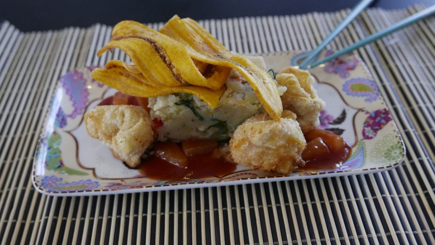- Warm je stamppot even door en serveer met de wontons enzoetzure saus en garneer met de bananen chips.