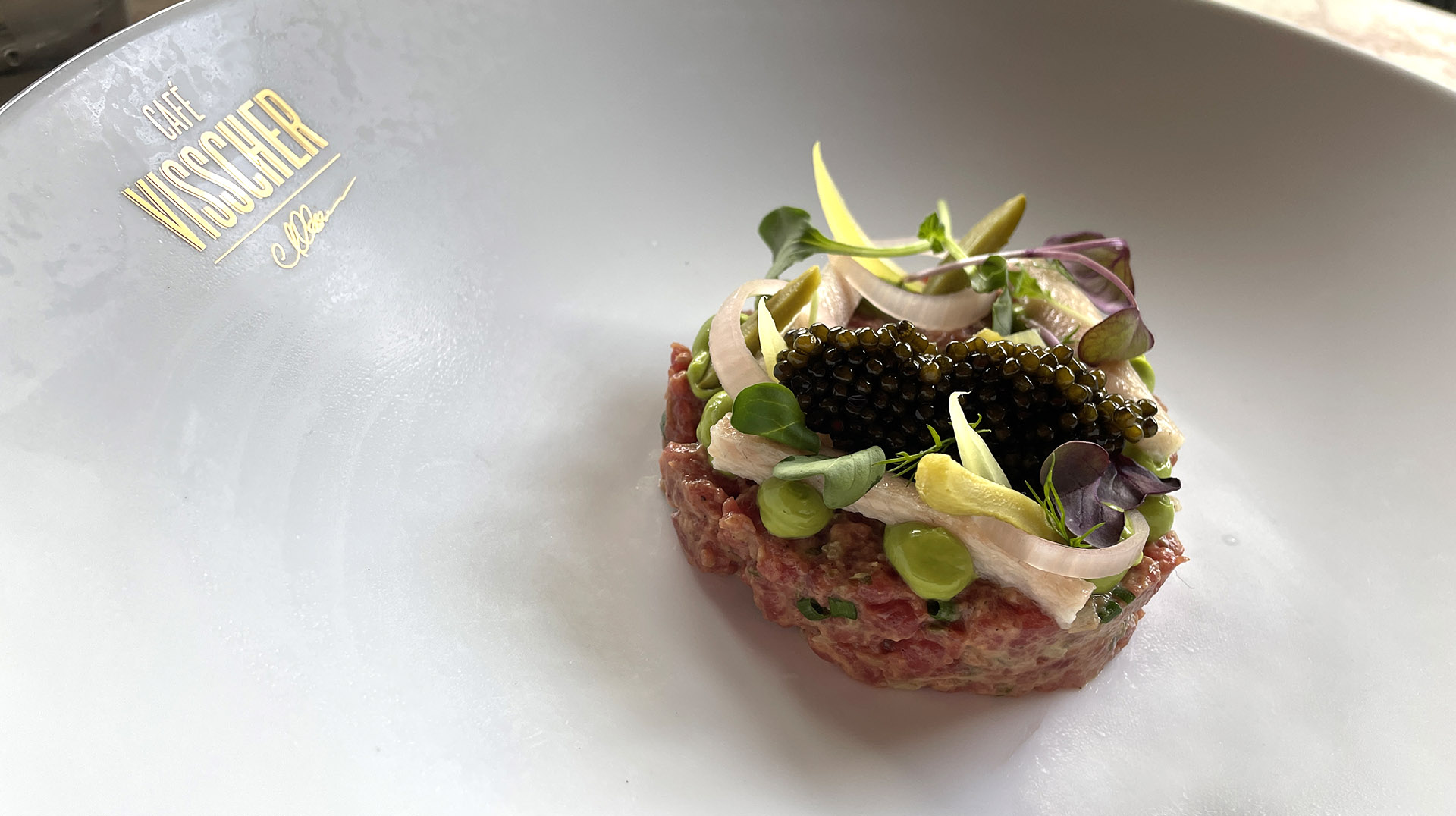 1,1K Café Visscher is een eetcafé met ambitie tegenover het station van Leiden. Chef de cuisine Arie Visscher maakt een steak tartare met gerookte paling en (optionele) kaviaar. Misschien vind je dit ook leuk Sliptong bakken met Ralph Woerde Terrine van octopus Ossenstaart met merg Oosterscheldekreeft grillen Octopussalade Fazant van Demandt De vissoep van Merkelbach Lasagna bolognese recept Verse worst met een scenario De kreeft uit Het Bosch