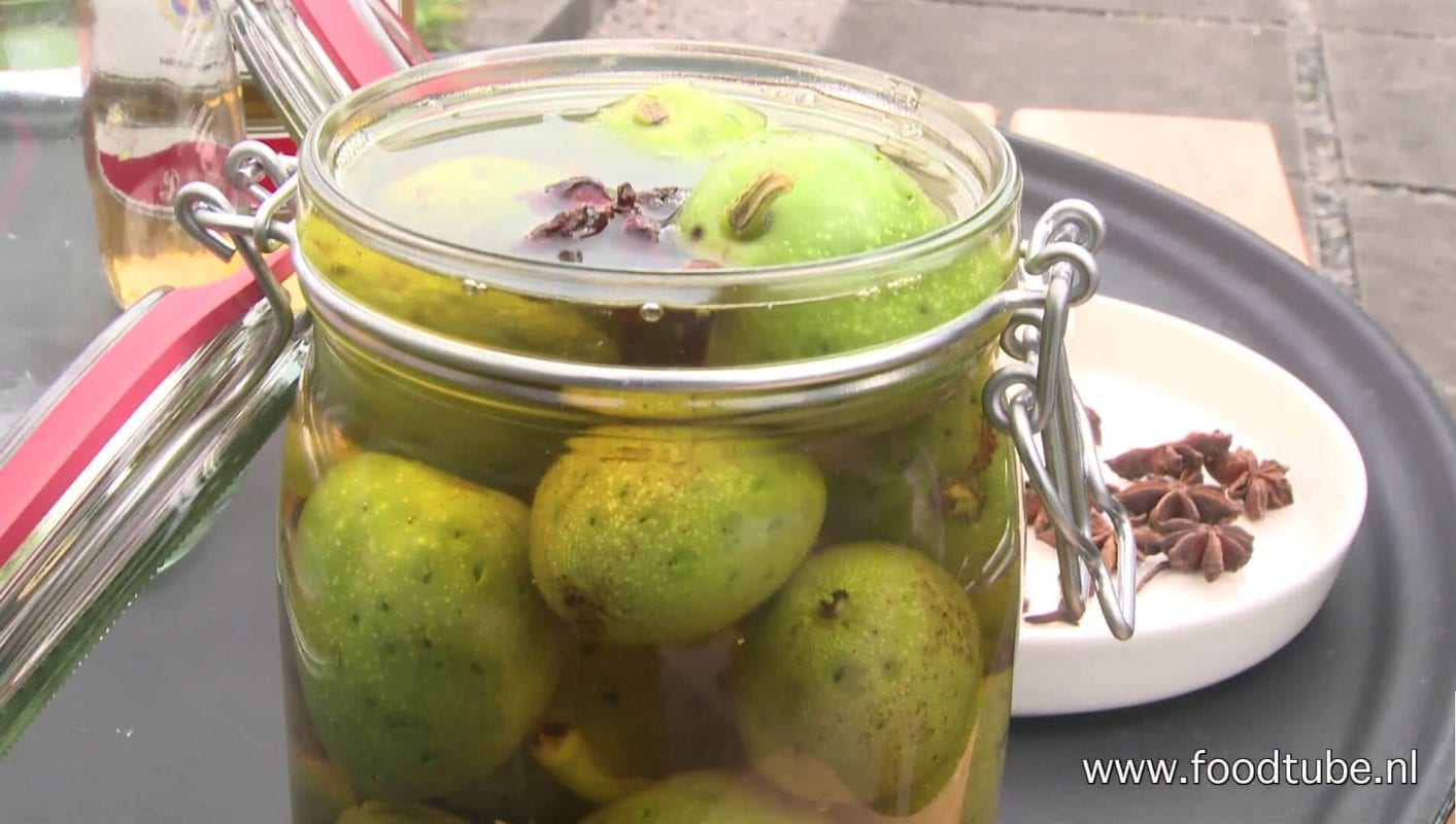 20 walnoten in groene bast, geplukt half juni, maar in augustus kan het ook nog.